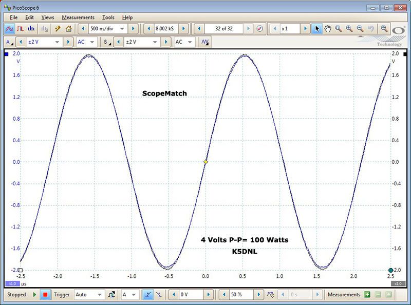 O-Scope reads 4.0 volts peak to peak, multiply 4X50 = 200 and 200 squared is 40000/400 = 100 watts.