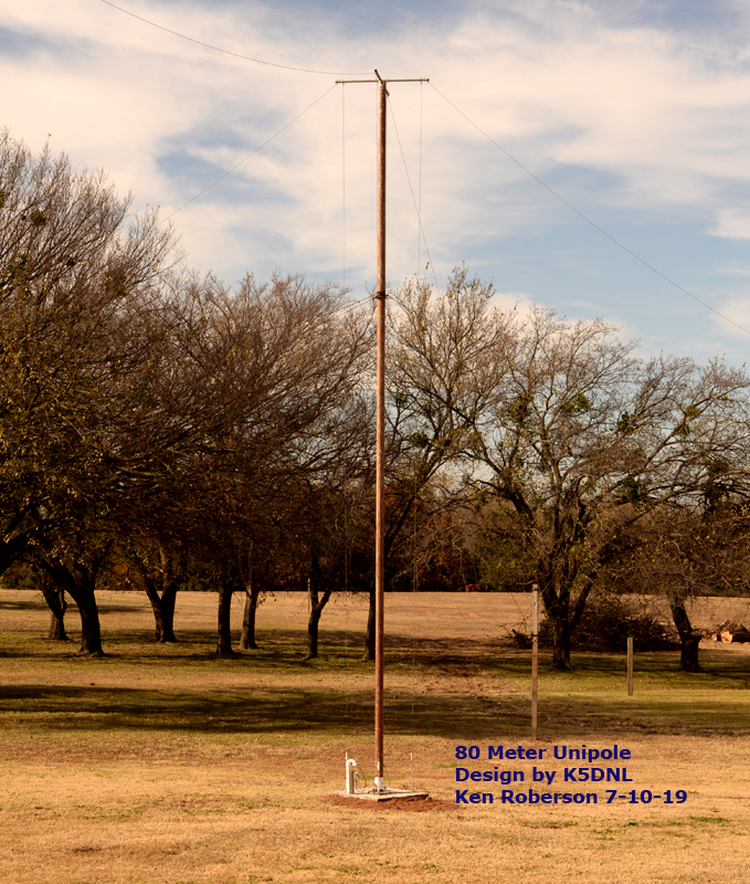 The antenna is 30 feet X 4 inch irrigation tubing with 4 drop wires and 4-20 ft top loading wires with only 8 ground radiald 35-45 ft long could use a few more. |